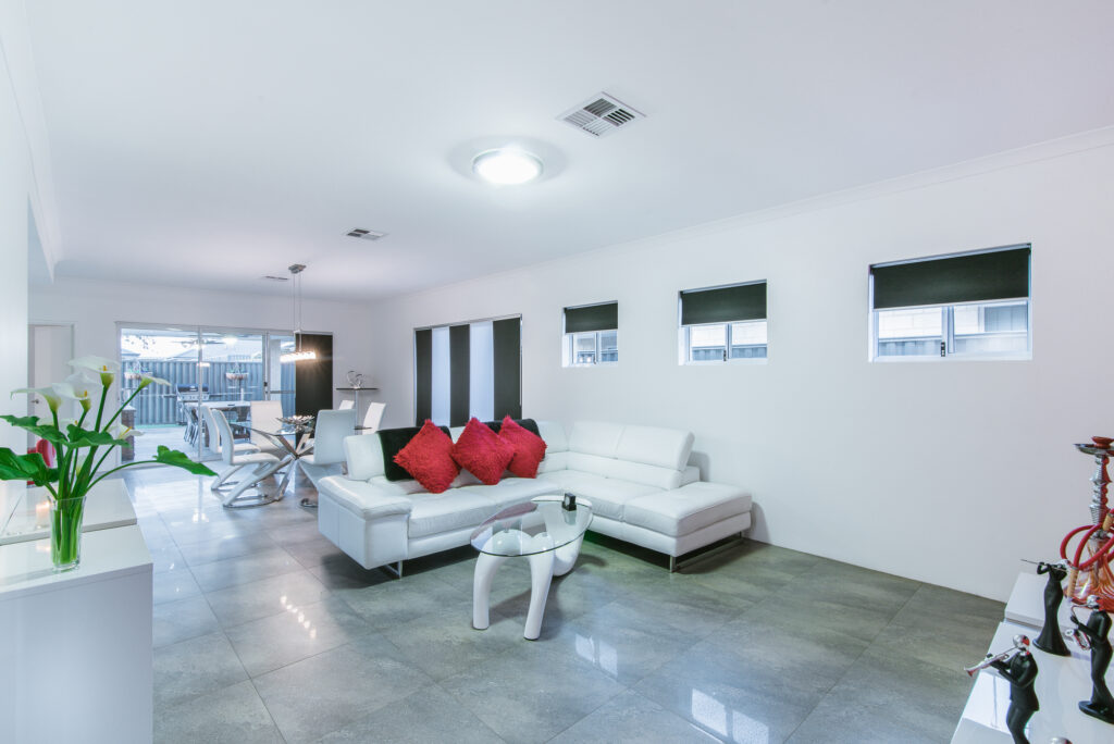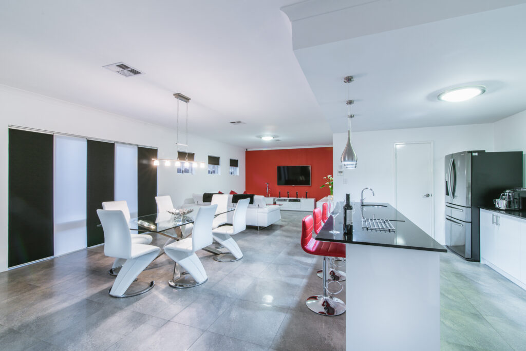 – Open plan living with black and white panel blinds