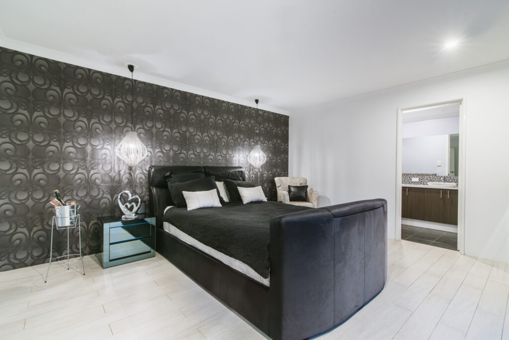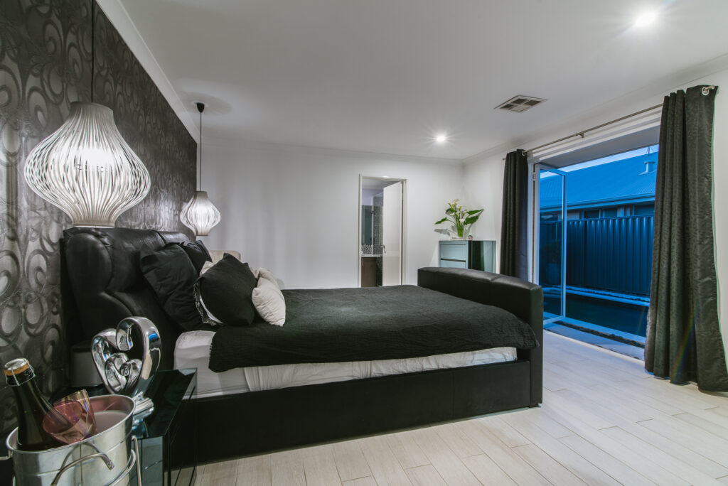 – Stunning master bedroom with glass french doors – having direct access to the MIDNIGHT POOL. Yes a Black Midnight pool- resort living!