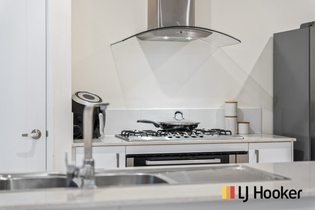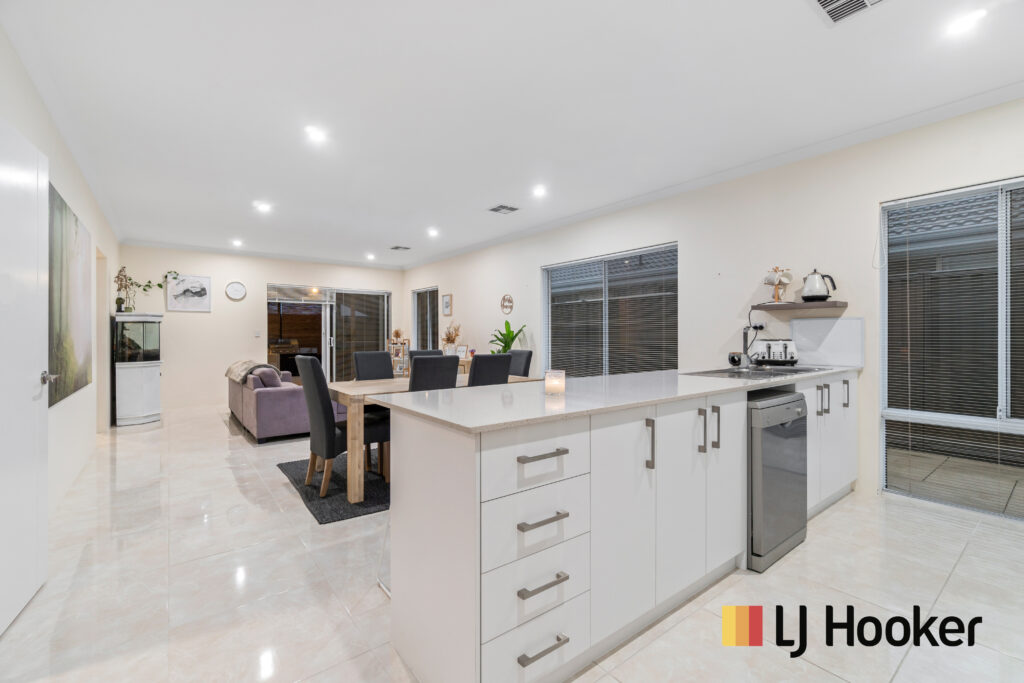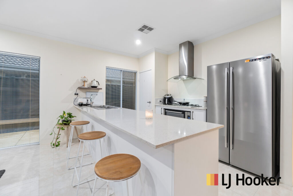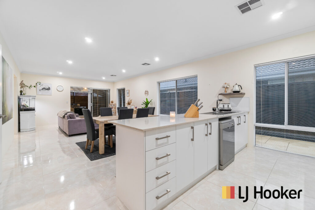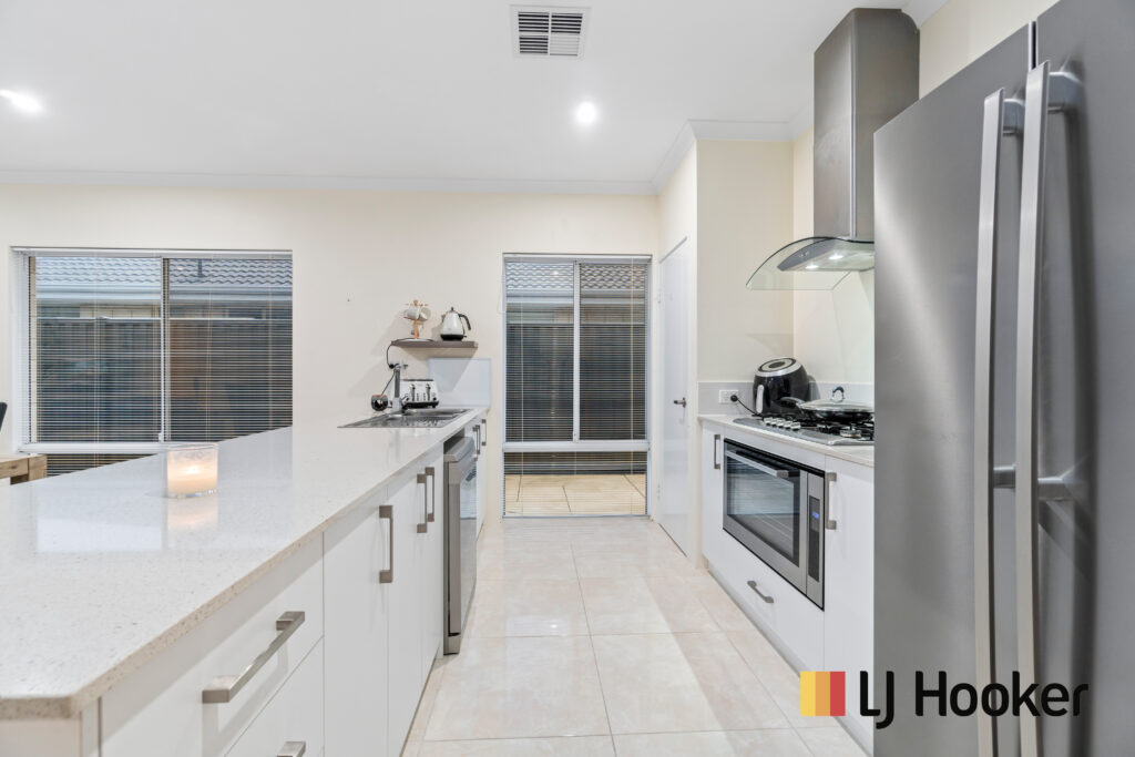 • Kitchen is large with a good size pantry with door installed, with extra cupboard space, massive stone island bench matching with floor tiles with huge breakfast counter, spots for microwave, kettle and toaster, massive amount of soft closing cupboard space, a stand-alone 900mm oven & gas stove plus a huge fridge recess. Has a big spacious laundry and will easily fit in a big washing machine plus a clothes dryer. It also has plenty of bench space, cupboards and enough hidden storage under the sink.