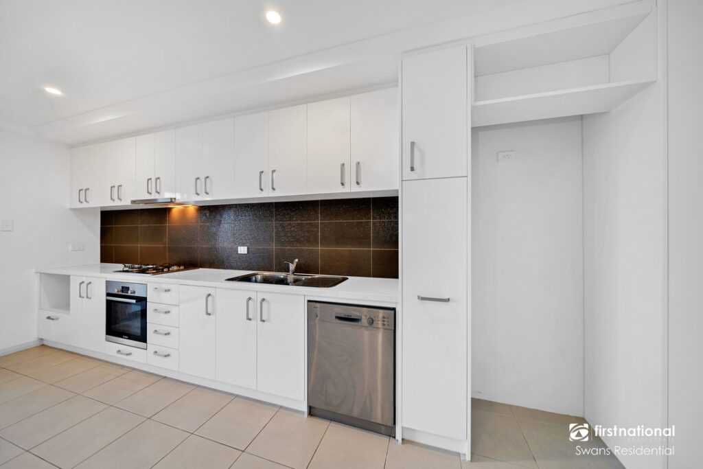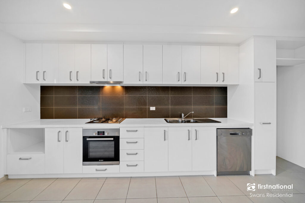 Entering the open-plan lounge room, this is the spacious hub of the home, displaying flawless fixtures and finishes throughout. The kitchen is equipped with quality stainless steel appliances, including a gas stove, oven, and full-sized dishwasher. A beautiful backsplash sprawls across the kitchen, adding the perfect hint of luxury and modernity.