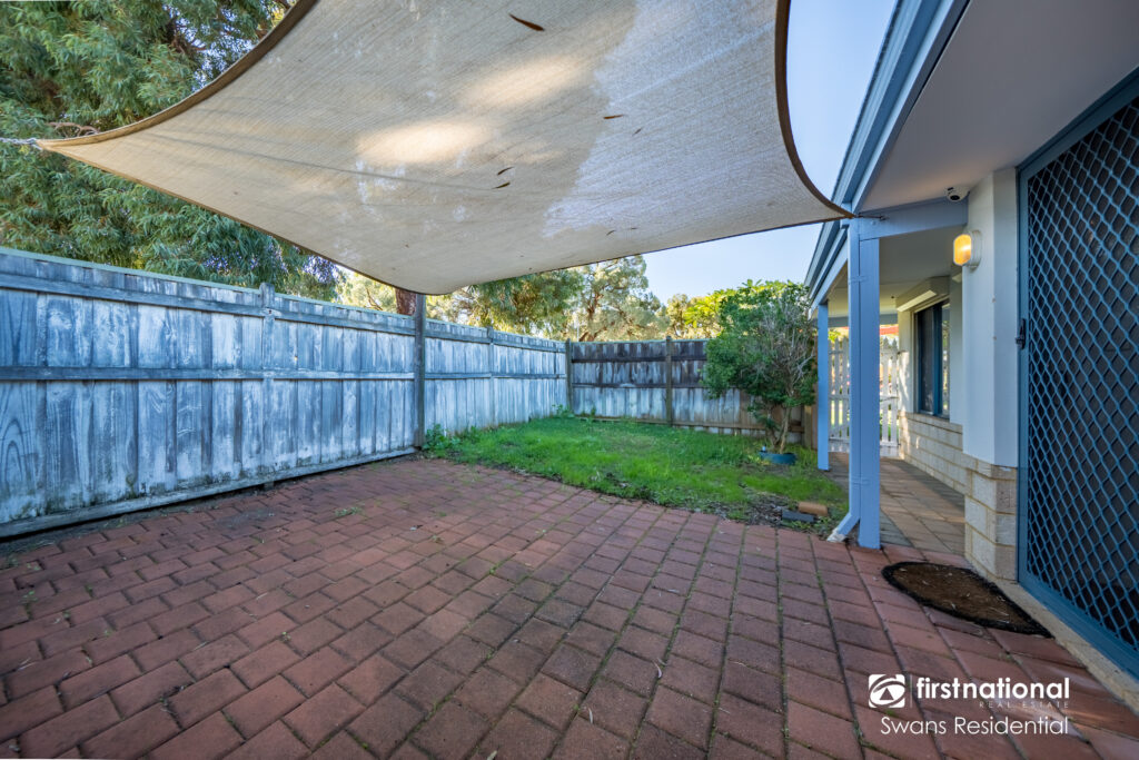 • Low-maintenance paved backyard with a patio area