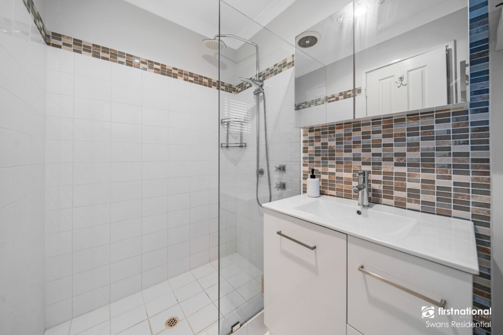 • The ensuite includes a roomy shower and vanity with mirror cabinet on the wall
