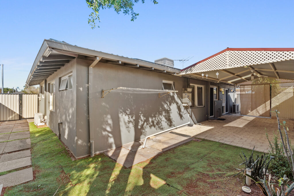 • Synthetic lawn and shed at back of house