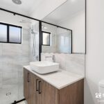 • Ensuite with a spacious shower, elegant vanity, large wall mirror, and toilet