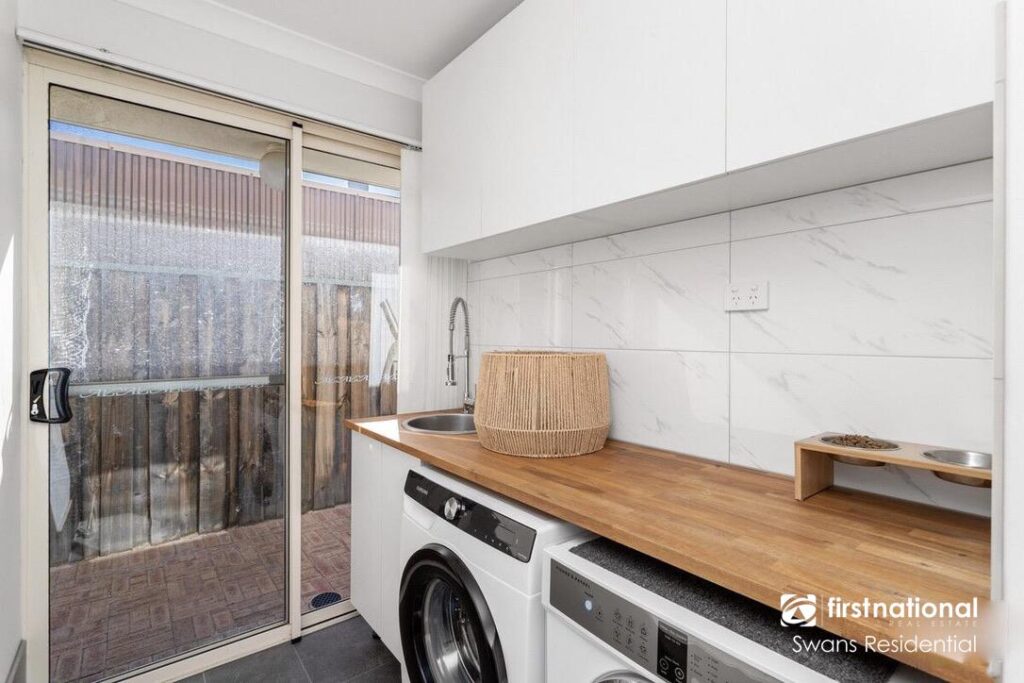 • wooden laundry bench-top and cupboards for extra storage