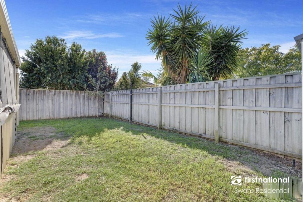 • Enclosed backyard with green lawn and pavers
