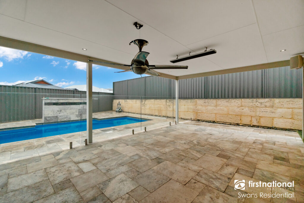 • Alfresco entertaining area with tiled floor, ceiling fan, heat lamps and outdoor speaker