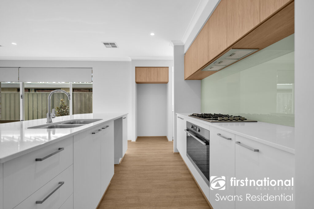 • Modern kitchen with 900mm gas stove, electric oven, and dishwasher recess